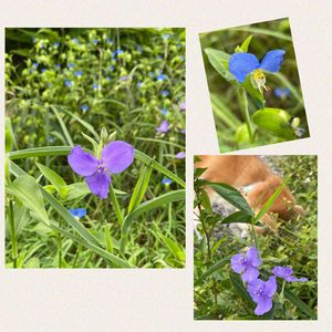 朝🐕散歩 今日のお花 ムラサキツユクサ ⬅️紫露草とバックは露草 ↗️露草 ↘️紫露草とおまけの柴犬🐕 ここのまわりには紫露草より 野生種の 露草が圧倒的に多く咲いています💕