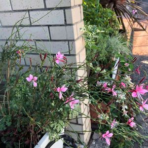おはようございます☀ 玄関右側のお花たち🌸 ピンクのガウラが綺麗💖 ハツユキカズラ、ネメシア、ツルバキアもピンクで可愛い💕