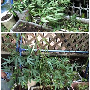 台風の爪痕② ローゼルが倒れた〜💦 支柱って言っても何も無かったから どこからか飛んできた木を解体して 支柱としました。 花が咲く前で良かった😭