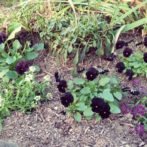 残ったビオラを地植えにしました。 チョコレートコスモス ビオラ 黒 アリッサム 白 アリッサム 紫 大きさなりますように☺️