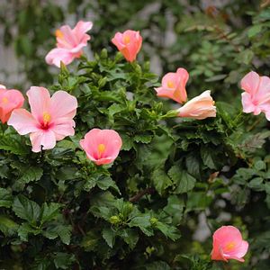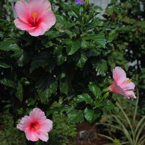 エラブ の春(ハイビスカス) バラは夏剪定し、クレマチスもひと段落中なので葉っぱばかりの庭で、華やかにしてくれています。