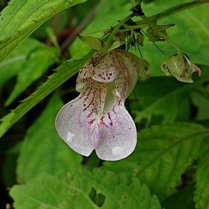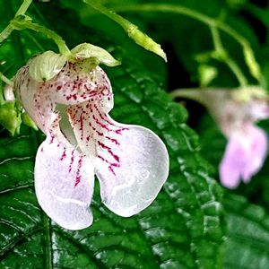 名前の通り 葉に隠れるように咲く ハガクレツリフネ🌿 (葉隠釣船) 和歌山〜四国 九州に 咲くそうです🫧🎶 *ツリフネソウ科 *ツリフネソウ属