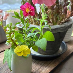 長年水栽培してる多肉のミルクピッチャーに 夏の花 切り戻したちをIN✨