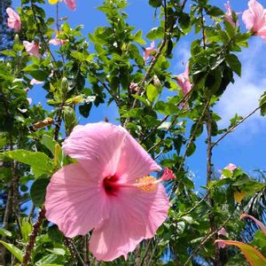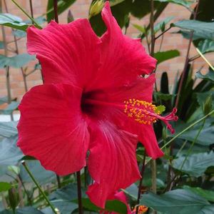 2年半前の沖縄出張の際、ホテルの生垣の剪定で捨てられていた割り箸くらいの枝を持ち帰って挿木したら、背丈くらいに大きくなって、一年中咲いています。沖縄ではそこらじゅうに咲いてるただのハイビスカスですが。