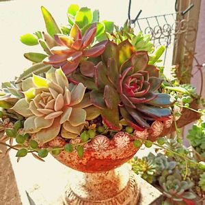 今日は天気もよく 暖かかったので 予定を変更して寄せ植えを手直し♪ 夏の間みどりんだったルドルフも赤くなってきて 何年も前からいるローラもピンクっぽくなってきて 5年位愛用のカップ型の鉢も錆び錆びになってきた😆💦 みんなみんな長年のお付き合いで宝物なのです❣️