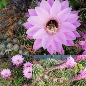 お願い🙇♀️ サボテンの種類の名前、教えてください。 うちに数年一緒に暮らしているサボテン軍団がいますが、 右下:サボテン科エキノプシス属 短毛丸、 左下: サボテン科 マミラリア属 月影丸 Mammillaria zeilmanniana (CCCRスキさんに教えていただきました😊 以外、種類の名前がわかりません😅 それと、一度も花を見たことがなくて 花を咲かせるには、何かトリックがあるのでしょうか?