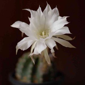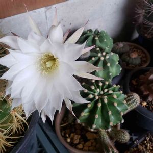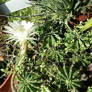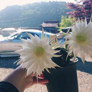 やっとお花が見れました〜‼️😆✨✨ 想像してたのとは違って、月下美人みたいなお花でした😊💕 今までは蕾が2つ3つ出来るんだけど、大きくならずに全部落ちてしまって😔 今回は凄い勢いで大きくなって、毎日ワクワク😊✨今朝見たら純白の儚げなお花が❣️😆💖 慌てて写真に撮り、夕方仕事から帰ったら萎んでました😯 名無しのサボちゃんですが、来年もお花見せてね😊 👉エキノプシス属のサボちゃんだそうです😊CCCRスキさん、ありがとうございます❣️