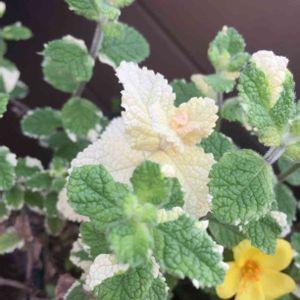 パイナップル ミントの 葉っぱ🍀 斑入りに 真っ白な 葉 も まじり 涼しげです🤗 黄色のポーチュラカも 覗いてます🎶🎶🍀