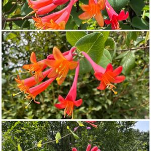 《溜まってしまった夏~秋にかけての山野草たち》 里山を歩いてると、民家の庭先に花たちにも癒されますね😊 実に鮮やかな赤い花は、ツキヌキニンドウ(ロニセラ)、明治の初めに入ってきた北米原産の園芸種ですね。 スイカズラの仲間で、冬でも落葉しないスイカズラをにんどう(忍冬)と呼ぶことと、上部の葉を突き抜けるように花をつけることからの名前ですね🤔