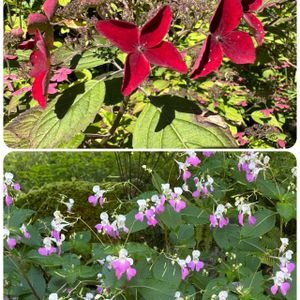《溜まってしまった夏~秋にかけての山野草たち》 園芸種には知識もないし、自然中でふと出会う楽しみもあんまりないけど、花は可愛いのが沢山ありますね、あんまり名前は覚えないけど💦 そのうちでもよく見る好きな花たち、⬆️はヤマアジサイの園芸種のクレナイ(紅)、⬇️はツリフネソウの園芸種のハナツリフネソウ😍
