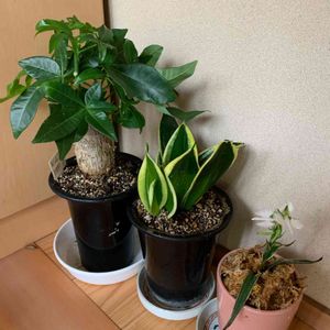 我が家の玄関の癒し〜😍 ダイソー産のパキラ・サンセベリアと HCで買ったさぎ草の銀河〜✌️