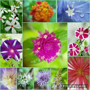 今日の庭の花🌼 朝顔以外はどれも小さい花だけど可愛いもんね~✨ アメリカンブルー 朝顔 ベビーサンローズ ヤブラン アゲラタム(紫、白) リンドウ 朝顔 ニチニチソウ夏花火 ランタナ 千日紅
