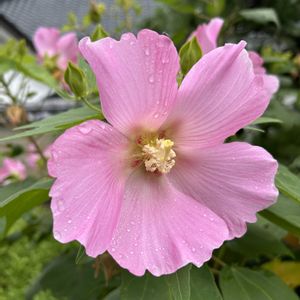 〈 フヨウ 〉芙蓉 〜 今日のお花 〜 ◉アオイ科 落葉低木 華やかな花を枝一面に咲かせます ムクゲとの違いは 雌しべが 5つに分かれ上に曲がって います 葉の大きさが大きく手のひらのような 形をしています ◎雨の予報は出ていましたが 出先で いきなりの雨☔️ バケツをひっくり返したような という表現がピッタリ‼︎でした
