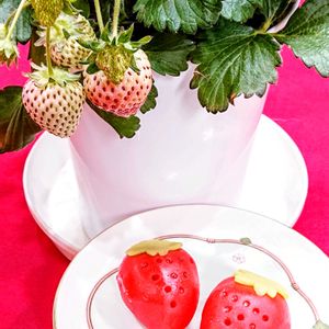 鉢植えのいちごが花が咲き実も沢山なりました。 しかしまだ食べごろではないので和菓子でいちごを作ってみました。