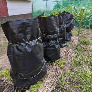 セロリ軟白化するために防草シートでくるみ遮光します。今は緑色の茎がスーパーでよく見る薄い黄緑になれば食べごろ😃試しにこの間外側のを3本かきとって試食したら、爽やかな香りと歯ごたえ😋せいこうしますように😆