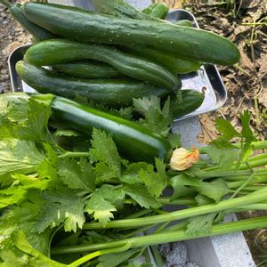キュウリたっぷり収穫出来ました。 そろそろキュウリの株も疲れて来た感じなので最後の力を振り絞ってるのかな…⁉︎⁉︎ シャキシャキのセロリも収穫❣️ それより何より😆初ズッキーニが嬉しい〜