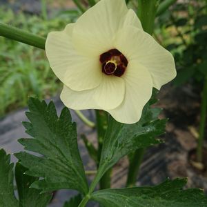 こんにちは☂️ 今日のお花 オクラです 隣から初めての挑戦の セロリがちょこっと顔出し サラダで食べたいなぁと思っていたのですが どうしても筋が気になってしまいます うーむ 中々難しい🤔