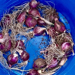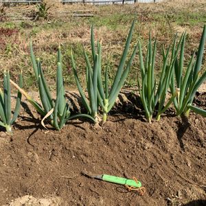 畑の草むしり😅宿根ネギのさつき姫が草むしり道具の先まで根っこが生えてます😀ネギ栽培は草取りが大事っていいますね、納得😀これは6本が20本に、別畝の5本が15本に増殖してます😊沖縄伊江島の島らっきょうの試し掘り😀いい感じです😀平戸ニンニクの芽を収穫🎶😊10時には暑くて退散24℃😅カールくんもハァハァ言ってます😅💦