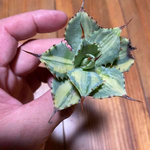 おはようございます(^^) 肌寒い位の日曜日の朝ˆˆ 中斑と縞斑と散り斑が入り交じった子(*´`) 充分綺麗だけど 直射下の方が彩が綺麗だなぁ(*´`) の、楊貴妃さん٩( ᐖ )۶ Agave isthmensis f.variegata 'YOKIHI' #Variegataへの蕩めき #トゲトゲへのときめき #ウォーターマークへのドキドキ #成長点への煌めき