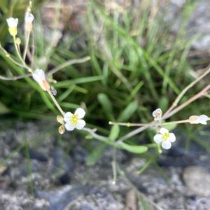 ミヤマハタザオ(深山旗竿) アブラナ科シロイヌナズナ属 ピンぼけで スミマセン😆💦 4合目(標高2020m)と 5合目(標高2300m)の歩道のコンクリートの隙間に生えていました🤍🌱 花の大きさは6mmほど 長角果は開出しています 茎上部の葉は線状で鋸歯はほとんど無く 白緑色で、茎を抱かず、無毛でした 根生葉は隠れて見られませんでした🌱 富士山では固有種のフジハタザオが標高2000〜3000mで見られるそうですが 葉に鋸歯があり花の開き方も違うようです🤔 あちこち調べてミヤマハタザオではないかと思いました 分布: 北海道、中部地方以北の本州、大山、剣山の山地の砂礫地や岩場 花期: 6〜8月 違っていたら、ご教示お願いします🙇♀️