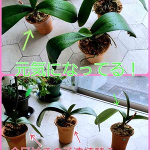 胡蝶蘭 水苔& ミディ バーク 久々に晴れた時は外に出すようにしてます 室内に置いておくと、素焼き鉢の方は乾燥しにくいので、水も控えてます💦 ミディは葉焼けもあるし、筋が入っていてあまり変化はみられない、、、 けど真ん中の子は新しい葉っぱ生えて来そうなので安心しました😀