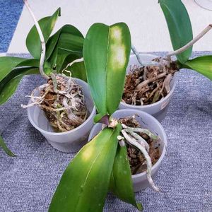 胡蝶蘭 人から頂いてきました! 以前から花が終わったら捨ててるって言われてたので頂いて来ました! もっと早く取りに行くはずがなかなか行けず、、、とうとう枯れそうな状態になってました😣💦 葉焼けも起こしてますし、水も上げてないから乾燥しすぎてカラカラになってます💦 この子達はバークで育てようと思います(๑•̀ㅁ•́๑)✧