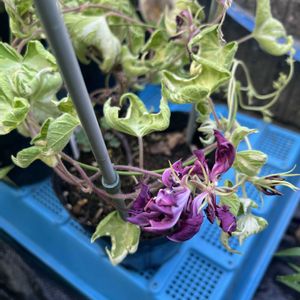 先日とは別株 変化朝顔 黄斑入掬水龍葉黒鳩風鈴牡丹 太陽光の下では、濃い紫 部屋の光だと黒に見えます 花は9cmくらい コレも根腐れ寸前😭