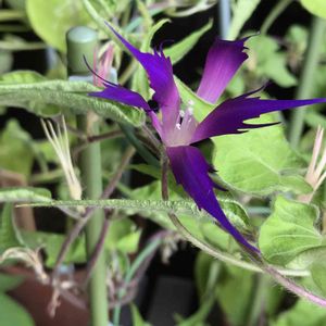 濃い紫色の変化朝顔です。 涼しくなって元気になるはずが、 ホコリダニらしき症状で、 葉っぱとツルが縮れてきちゃいました😣 でも、花はキレイに咲いてます♪