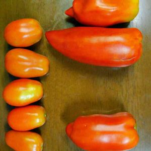 調理用トマトのサンマルツァーノ各種。 以下SMと略す。 左 SMルンゴ 全体的に小型。撮影していないが、SMリゼルバ はさらに小型。 右上 SMレドルタ 自家採種。混ざっているかも。角型で一番長くなる。 右下 SMレドルタ たぶん本物。でも固定種でないのか、丸玉のものも出現する。