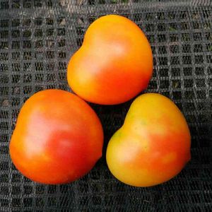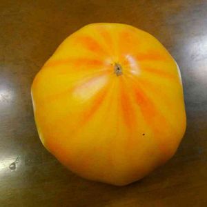 ビッグレインボー 大玉トマト。 皮も果肉も黄色に赤が混じる。味は普通のトマト。 ゼリー部分少なくみっちりした果肉質。