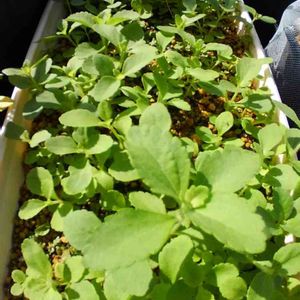 ステビアのこぼれ種が、枯れたトマトの鉢に生えてきた勝手に実生苗。 五~六ミリの赤ちゃん葉っぱでも噛むとちゃんと甘い。 用土は野菜果樹用の一番安価なもの。スリット鉢で底面給水のトレイをずっと置きっぱなし。つまりほぼ常時加湿状態。 同様の条件で鹿沼土細粒単用ではほとんど出て来なかったので、フキのような微細な種が用土と密着する必要がある模様。 自然実生なので覆土はなしのバラ蒔き。好日性と思われる。