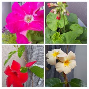 今朝の西側ベランダの花はな…🌸💮🌿… ↖️ペチュニア💓 ↗️ゼラニウム❣️ ↙️サンパラソル… ジャイアント… クリムゾンキング ❤️ ↘️サンパラソル… アプリコット…💛 外は今は…雨止んでます…😀… 蒸し暑い昼下がり…デス…💞❣️💫💚💜