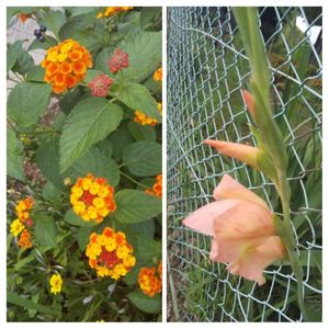 2020/07/05 花散歩👣🌿🐾🧡❣️ ⬅️ランタナ… 別名…七変化… 花色も白からピンク🌸〜紫、 橙から赤と変化するもの…黄色一色など色々あるようです… ➡️グラジオラス… フェンスの隙間から…お外へ出たいのねぇ…ウフフ🤭… オランダショウブ…とも言われ…属名はラテン語の剣という意味…🌿の形から名づけられています… 可愛かったわ!!!…😀\(^o^)/🧡❤️🧡❤️💫💚❣️💯🙆