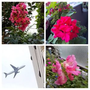 花散歩🐾👣🌿✈️… 2020/07/05… ↙️川西上空ビルの隙間ギリギリセーフ… ショット…ANAカナ!?! ↖️サルスベリがキレイに咲いてました…ビルの横に…😀… 我が家のベランダに咲いた…🥀🌸🌺🌿 ↗️ゼラニウム… ↘️キンギョソウ… ✈️が見れて幸せ🤗🎀❣️💫💜🌿🙋