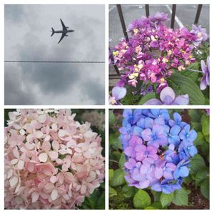 2020/06/21 花散歩…👣🐾🌿💜💓💞💚… 音がしたから…慌ててパシャッ…と!! 撮れてたわ…ヤッタ… (*˘︶˘*).。.:*♡✈️✈️ ☁の中に消えていきました…✈️🍃… 紫陽花 ↙️ピンクアナベル ↗️ピンクのガクアジサイ… ↘️半分青い紫陽花 どれも可愛い出会いでした… ✈️は嬉しいラッキーな出会いよ…❤️💞💢💝❣️🌈🎀