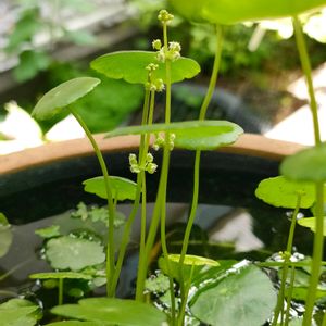 暑さに負けず我が家で元気な、ウォーターマッシュルーム! 丸い葉が可愛い❤(ӦvӦ。) 花も咲いてます。 鉢を乗せているのは土鍋の蓋! 少し水が溜まります。
