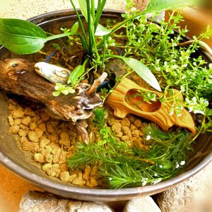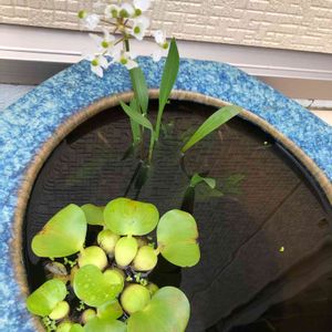 グリーンウォーターの中から抽水植物がまっすぐ伸びるような水鉢を夢見ていたのに、かーなり綺麗でぴーいかぴかな水に…。 水換えなし(足し水のみ)でこの光り具合。底材の溶岩石に三種の神器(マツモ、ヒメタニシ、ミナミヌマエビ)が入っていてオーバーキル状態なので当然といえば当然なんですが。ていうか溶岩石マジおすすめ。 ちなみにスイレンと同居していた未草は勢力争いに負けたのでこちらに引っ越してきました。
