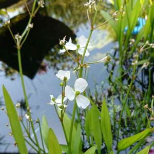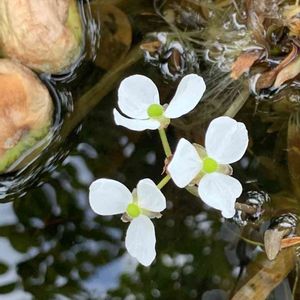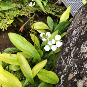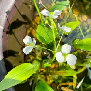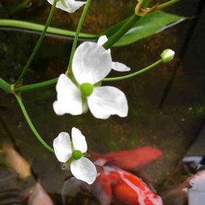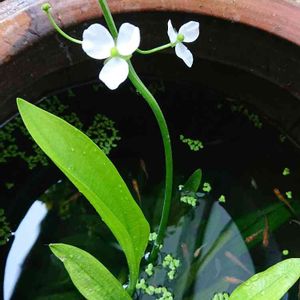 お隣さんで、メダカの学校はやってます😊 Sagittaria graminea 長葉オモダカ 漢字表記は長葉面高って花の位置が高いカラ?