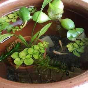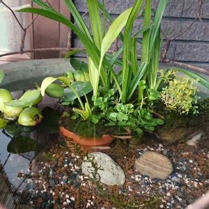 ホームセンターの「メダカ喜ぶ水草」というのを入れたら 一晩でビオトープがピカピカに 水を浄化する水草と石がセットに、なったものでした。 お花も咲くみたいで楽しみ 水入ってないみたいだよ おどろき