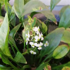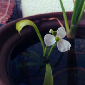 姫スイレン バーバラとナガバオモダカの寄せ植えをしました。 植え付けて一週間もしない間に ナガバオモダカの最初のが開花。❗️ 小さくて可愛い花です。