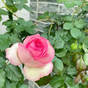 バラ アクロポリスロマンティカ 今春、我が家で一番最初の開花 花びらの裏側は薄いピンク 表側は濃いピンク 咲き進むと花びら全体がベージュになる・・・はず