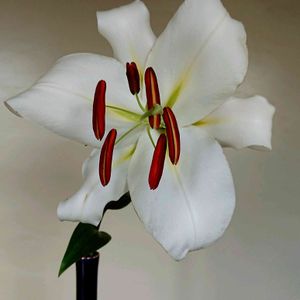 一輪だけ 今年も咲いてくれました👋😉💓 こぶりな カサブランカ🤍 茎が細くて下を向いてしまっていたので、玄関にお迎えしましたー🎶 良いかおり✨
