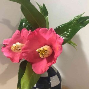 ⚪︎キンギョツバキ 金魚椿 今年は温かくなったら一気に咲いてしまいました♪♩ ポタリとした花形、上品なコーラル色の花びら、しっかり結んだしべ、そして葉先が割れて金魚のしっぽのような葉っぱです この椿だけは 花より主役は私よ‼︎ と ピカピカ✨に光る照り葉が 金魚しっぽを振りながら申しております
