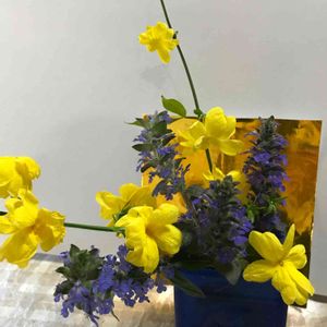 💛春ノート 早春花(八重)と 西洋十二単(アジュガ) バサッと生けてみました 黄色と紫がバッチリ合いますね〜♪♩ 強い花達です パワー📣 歳と共に 黄色💛が好きになりました
