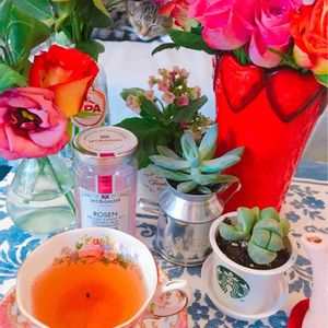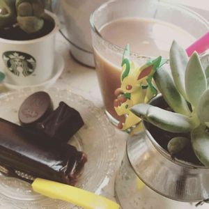 植物に囲まれてお茶会( ´⚰︎` ) ▽ リーフィアが 栗羊羹を 狙っている