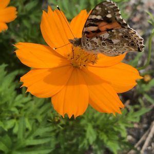 梅雨の期間中ですが、今日は晴れました。☀️😄 道路沿いの花壇にて「キバナコスモス」をパチリ!📸🧡🌿😊🤗🌞 オレンジ色の「ツマグロヒョウモン」蝶🐯🦋も来ました。 今日こそ⚾️🧡🏟️ファイト!📣✌️