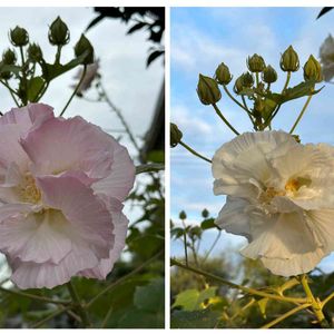 ⚡️🌀台風進路の皆様、被害が有りませんように🙏 酔芙蓉💕 朝☀️咲き始めは😀 真っ白、素敵❗️ 段々と頬を染めるように色が変化✨うっとり~ 午後には可愛いピンク色💕 翌日には萎みます😀