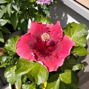 【1枚目】ハイビスカスが咲きました! わーい!\(^o^)/ ロングライフシリーズのダークグレイスという品種です。渋めの赤で、縁の色が若干薄く、中心部が濃くてキラキラしています。渋くて素敵😍👍 【2枚目】タグの絵だと中心部は紫色ですが、たぶん違うだろうと予想はしていました😅 タグには変に加工していない写真を載せて欲しいですよねー。 通常1日花のハイビスカスが、このロングライフシリーズは数日くらい保つらしいです。本当かどうか観察してみます😁 【3枚目】全体像。小さいポットだったので7号鉢です。今年は何とかこのまま行けるかな? ちょっと葉色が薄いような? 肥料は植え付け時に発酵油かすをやりましたが、ちょうど1ヶ月経ったので切れたのかも。追肥をしておかなくちゃ💪 まだ蕾がいくつか付いているので、何とか落とさないように咲かせたいです🥹🙏
