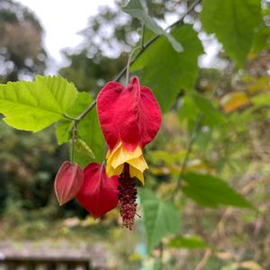 お散歩中に初見のお花を見つけ📸Googleレンズで検索🔎🤔 🌿❤️ウキツリボク(浮釣木)💛🌿というお花で通称 チロリアンランプとも呼ばれてるそうです🤓 コロンとした風船みたいな赤い萼(がく)の下に黄色の花が咲いて、雄しべ雌しべが飛び出ている、赤いランプが吊り下がっているように見えて可愛いね(*≧з≦)💕🤗💕