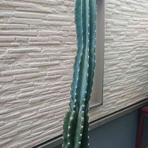 玄関にこの子を置いている家があってカッコいいと思いお迎えした鬼面角さん⤴️ 憧れの玄関サボテン🌵してたのですがわが家の玄関は陽当たりが悪くヒョローっと伸びたのであわててベランダへ😅 一年で倍位縦に伸びた半分位の太さで(笑)あわよくば太らないかなぁ💦